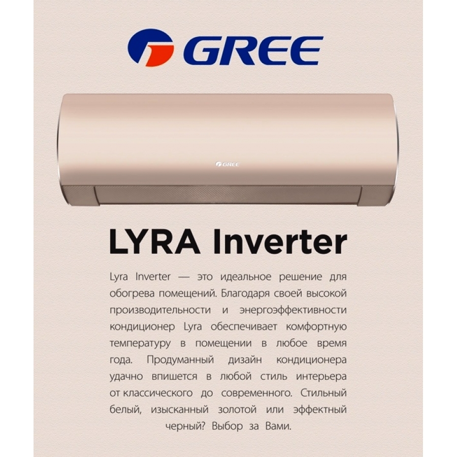 Настенные кондиционеры серии Lyra Inverter от Gree соблазнят вас своим интересным дизайном и широким функциональным ассортиментом. Внутренние блоки выполнены в золотистом цвете с плавными линиями корпуса. А внутри модулей находятся первоклассные компоненты и совершенная система фильтрации, которая может очищать воздух и пыль, болезнетворные микроорганизмы и другие загрязняющие элементы.